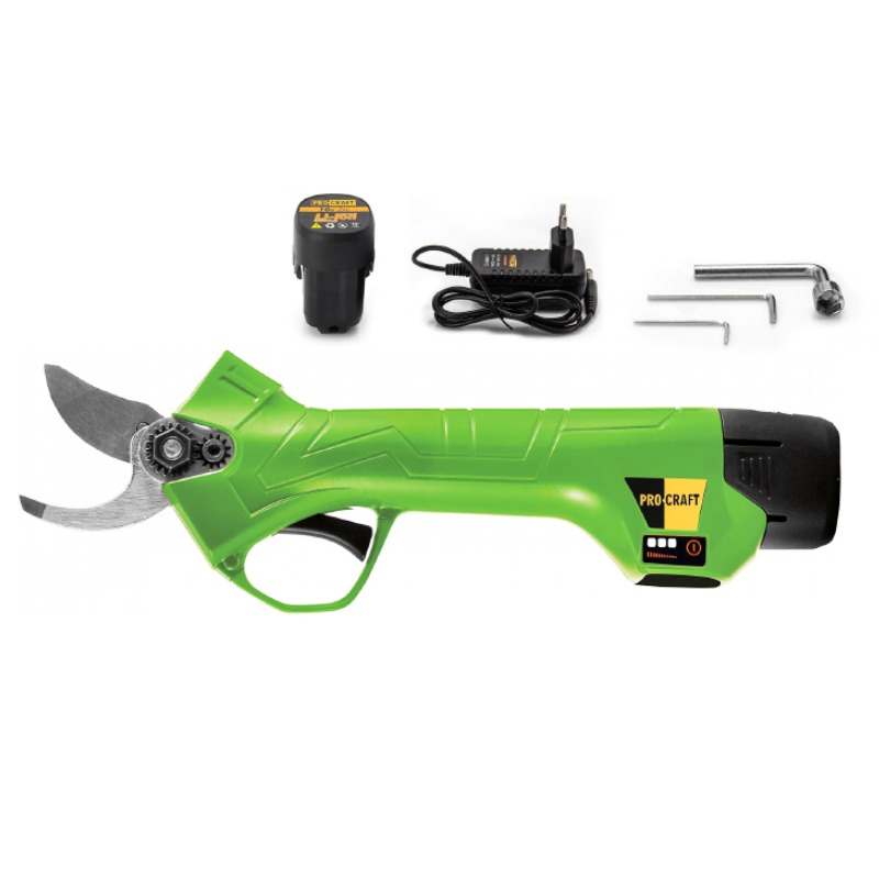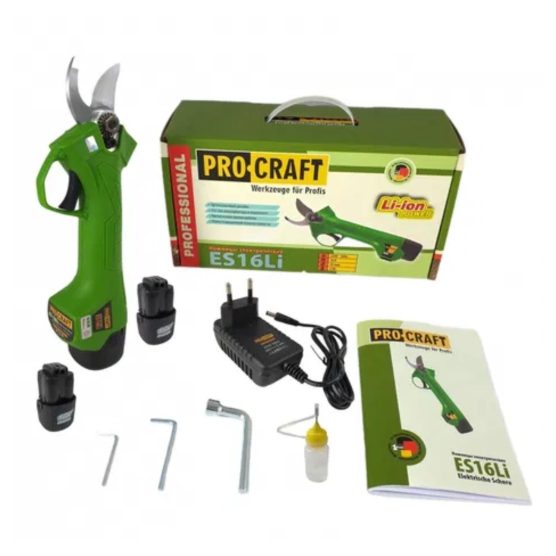 Акумулаторна градинска ножица PROCRAFT ES16Li с 2 броя Li-Ion батерии с напрежение 16 V и капацитет 2 Ah. Към комплекта е включено и зарядно устройство. Батерията се зарежда много бързо - само за 1 час, като с една батерия може да се работи в продължение на 8 часа. Максималната дебелина на рязане е 25 мм. Ножицата има заключващ механизъм, а ножовете са изработени от японска стомана.