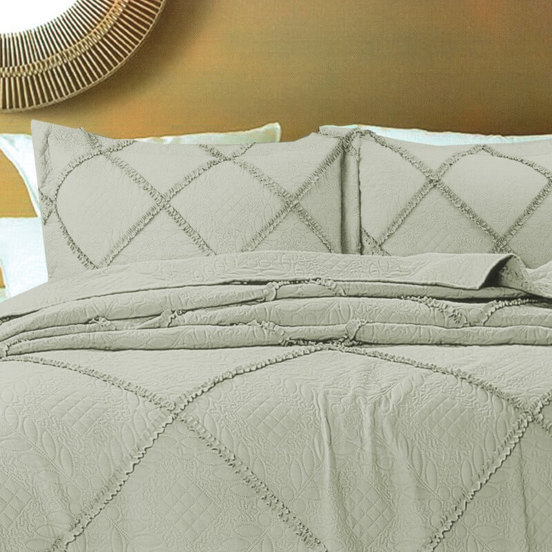 Комплект за спалня - изключително функционално покривало за легло и два броя декоративни калъфки с борд, осигуряващи удобство и комфорт у дома. Шалтето и калъфките са произведени от 100% висококачествен мокрифибър с декоративен "волани" елемент и пълнеж от 100 грама вата.