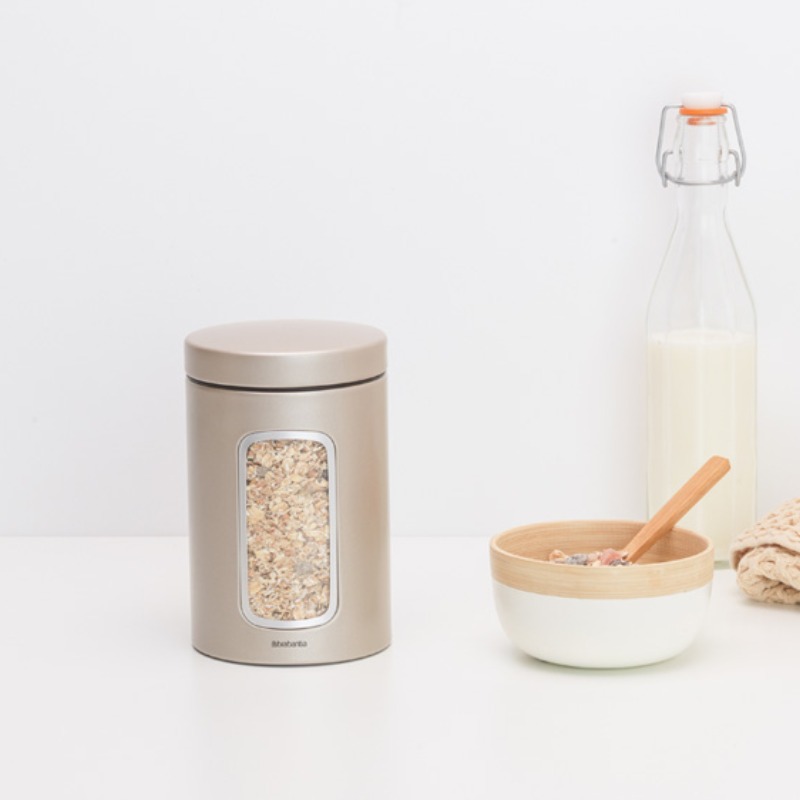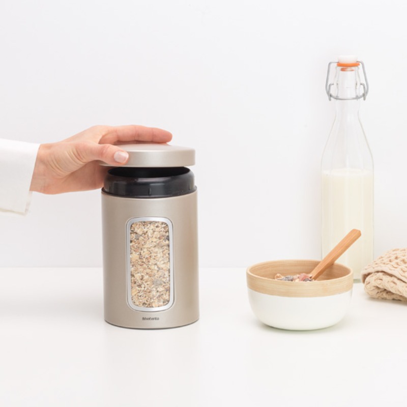 Буркан за съхранение на подправки, кафе, чай, ядки, захар, брашно, ориз и други подправки и хранителни продукти. Изработен е от устойчиви на корозия материали, които са безопасни при продължителен контакт с храна. Бурканът е лесен за почистване благодарение на гладката вътрешна повърхност.