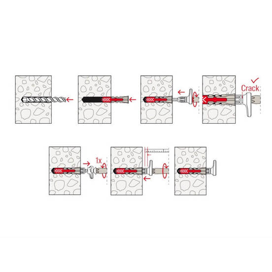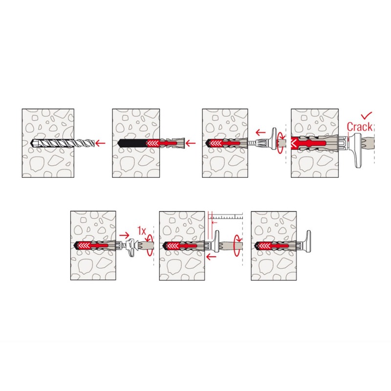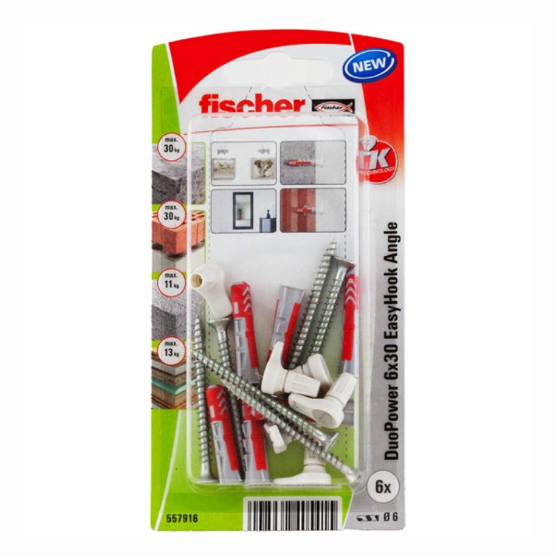 Комплект от 6 броя дюбели с Г-образна кука за монтаж на картини и огледала върху основи от всеки вид. Куките са устойчиви на натоварване от 11 до 30 кг (зависи от основата).