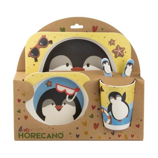 Детски сервиз за хранене HORECANO KIDS с красива цветна апликация на Пингвини. Сервизът за хранене се състои от 5 части – чинийка, купичка, чашка, лъжичка и виличка. Всички части от комплекта са Eco Friendly – произведени от биоразградими естествени материали. Не съдържат вредни вещества. Устойчиви са на високи температури и могат да се използват в микровълнови фурни. Издържат на темпелатури от -30° до +180°С. Всички части от комплекта може да се мият в съдомиялна машина и да се поставят в микровулнова печка.