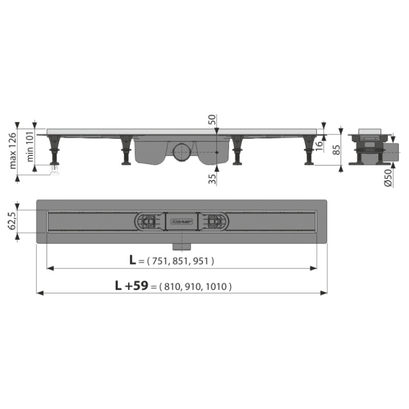 Линейният подов сифон за баня е с диаметър на сифона към отпадните води Ф50 мм. Максималният дебит на сифона е 63 л/мин. Разполага и с двойна защита против проникване на неприятни миризми от канализацията - воден затвор и клапа.