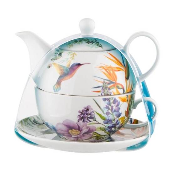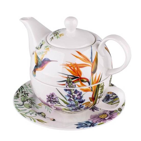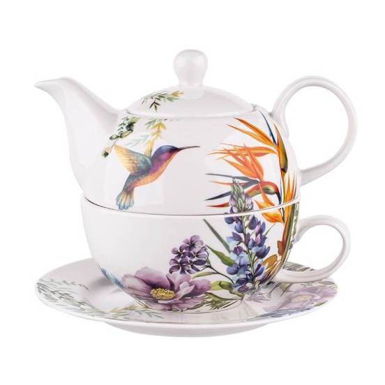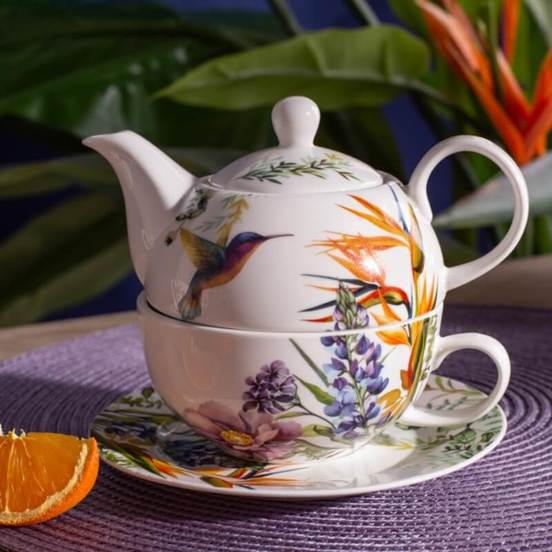 Комплект за чай, включващ чайник с камак и филтър, чаша, чинийка. Частите от комплекта са произведени от висококачествен порцелан. Всички части може да се мият в съдомиялна машина.
