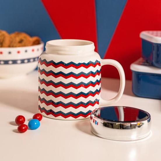 Порцеланова чаша тип Мъг за сервиране на всякакъв вид горещи напитки – чай, горещ шоколад, мляко, кафе и други. Чашата притежава атрактивен дизайн във формата на бурканче. Разполага с капак с огледална повърхност. Може да се мие в съдомиялна машина и да се поставя в микровълнова фурна (освен капачката). Порцелановата чаша е произведена по високи стандарти за качество.