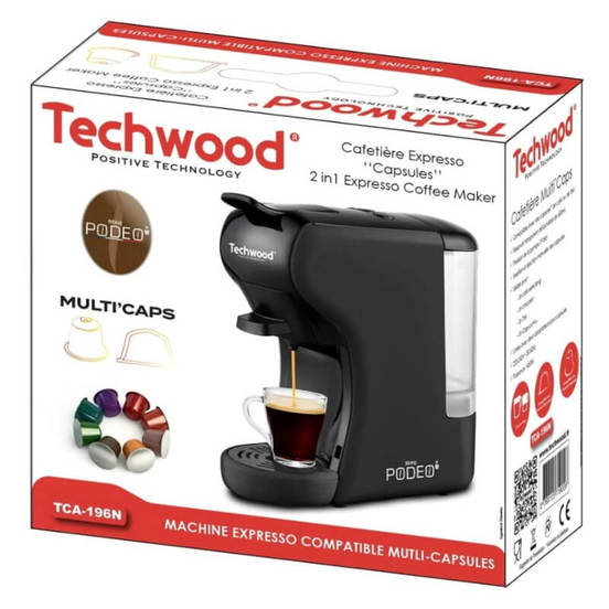 Кафемашина Techwood TCA-196N се характеризира с компактните си размери, елегантен дизайн и с отлична функционалност. Дава възможност за приготвяне на кафе и други напитки от най-популярните кафе-капсули - Dolce Gusto и Nespresso. Кафемашината с капсули има мощност 1450 W и поддържа налягане от 19 bar. Контейнерът за вода е с капацитет 600 мл. Управлението на кафемашината става изключително лесно и интуитивно – само чрез светещите бутони, разположени в горната част на корпуса на машината.