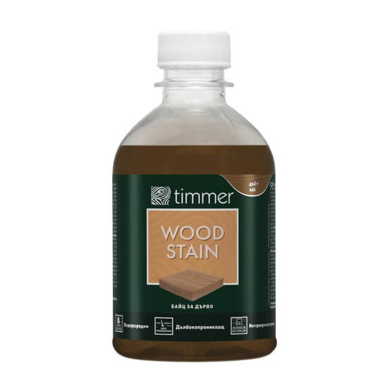 - Нанесете Timmer байц за дърво в 1-2 слоя по дължината на дървесните нишки. При нанасяне с гъба, повърхността се насища обилно, а излишъкът се избърсва с мека абсорбираща кърпа. За постигане на по-наситен цвят, трябва да се нанесе втори слой. При екстериорна употреба задължително нанесете Timmer водоразредим лак за дърво или Timmer полиуретанов лак за дърво след изсъхване на байца.