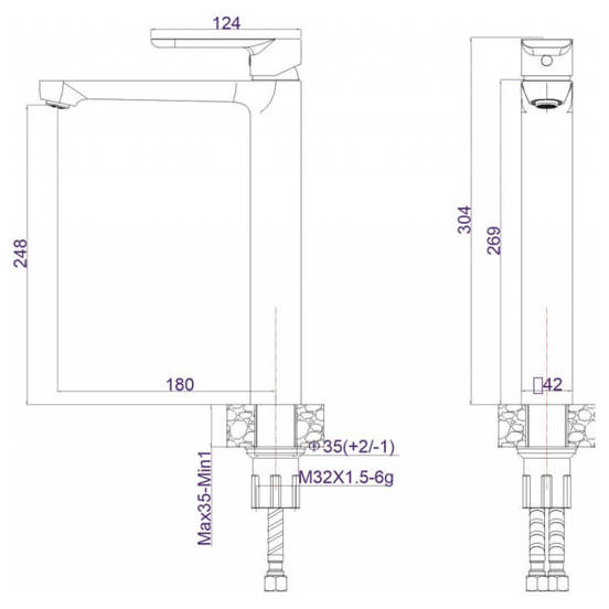 - Обща височина на смесителя: 304 мм