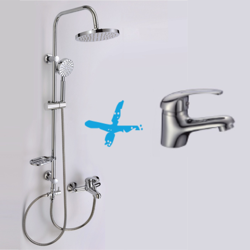 Комплект за баня INTER CERAMIC 6639, включващ тръбно окачване със стационарен и подвижен душ, смесител с превключвател за вана/душ и стояща смесителна батерия за мивка за баня. Смесителите са произведени от месинг със защитно покритие в цвят хром.