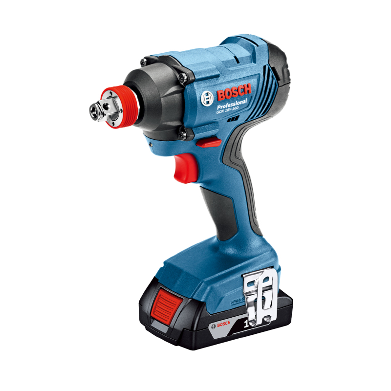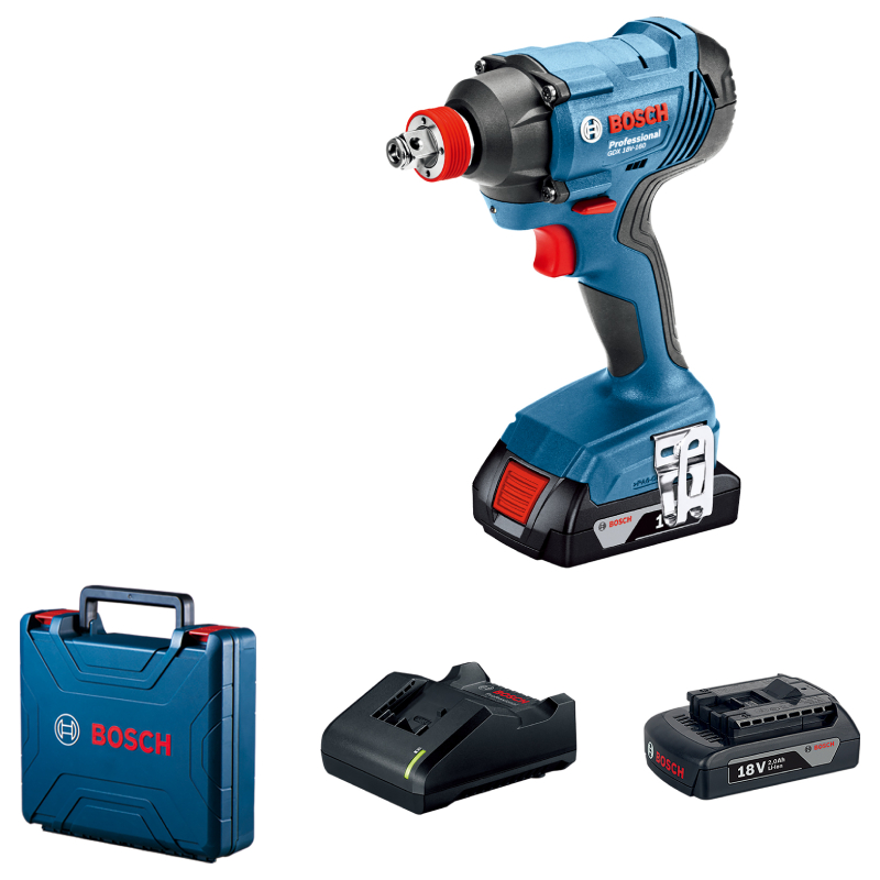 Акумулаторен ударен гайковерт Bosch GDX 180-LI с напрежение 18 V и максимален въртящ момент 180 Nm. Осигурява качествено завинтване на болтове, винтове и пробиване с един и същ инструмент. Оборудван е с 1/4" шестостенен държач за битове за завинтване и пробиване и 1/2" квадратен държач за накрайници за завинтване на болтове. Поддържа бърза скорост на въртене. Проектиран е със здрава конструкция за оптимална устойчивост на продължителна работа и големи натоварвания. Защитата на акумулаторните клетки осигуряват по-голяма продължителност на инструмента. Доставя се с 2 батерии, зарядно и куфар.