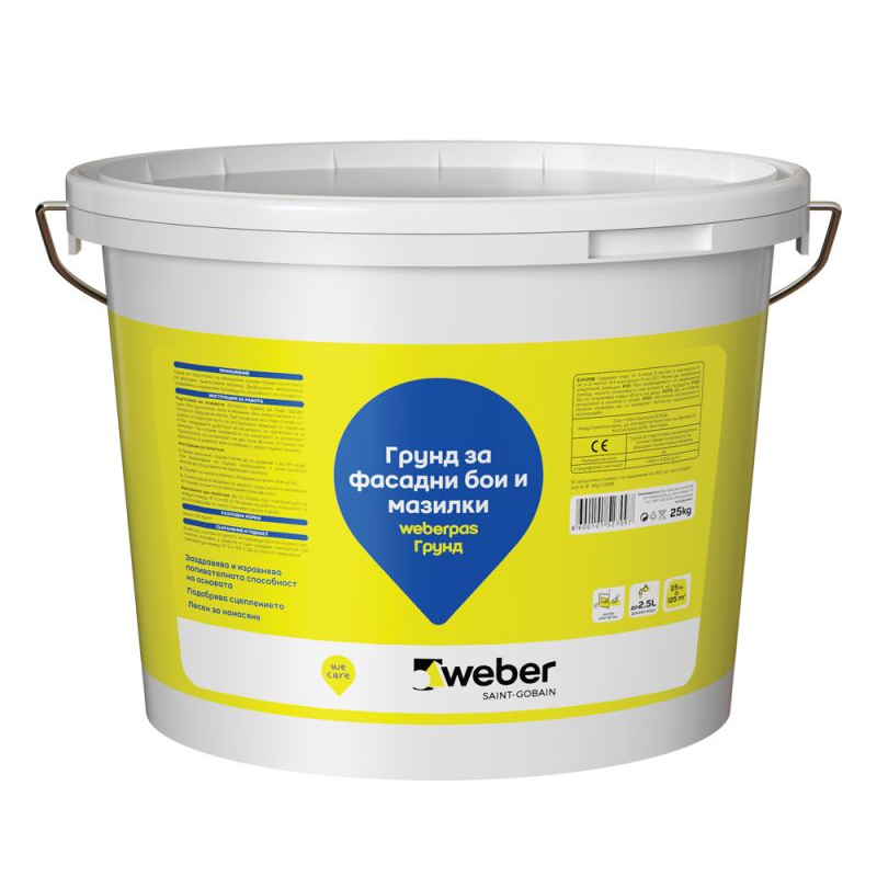 Weberpas Грунд е грунд за подготовка на вароциментови основи преди нанасяне на фасадни тънкослойни мазилки - силикатни, силиконови, полимерни, минерални и мозаечни. Дълбочинно импрегнира, заздравява и изравнява попиващата способност на основата. За вътрешна и външна употреба.