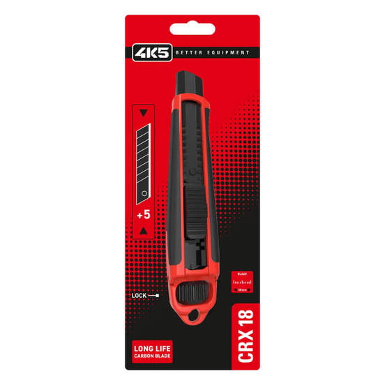 Макетният нож CRX18 на 4K5 е изработен с дръжка от ABS суровина и разполага със стоманен водач на резеца. Дължината на острието може лесно да се регулира. Не са необходими допълнителни инструменти за смяна на острието. Ножът се предлага в комплект от пет резервни остриета.