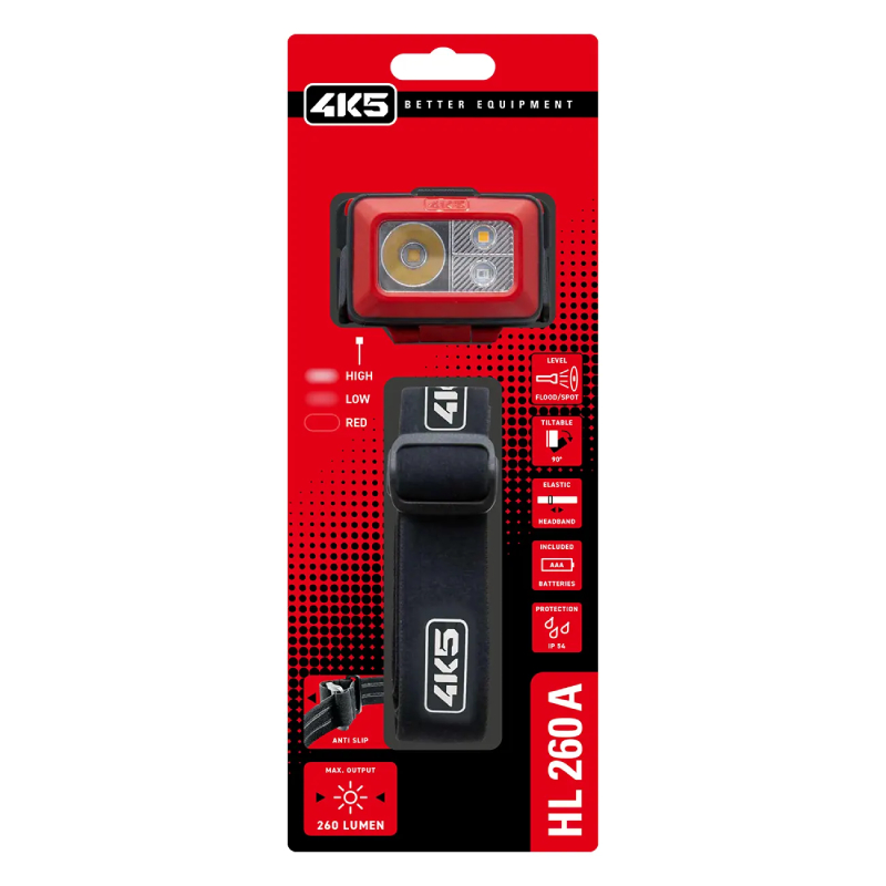 Челник 4K5 HL260A е с източник на светлина Cree XP-G3 LED, светлинен поток 260 lm и дължина на осветяване 77 м. Светлинния поток може да се регулира на три нива 3, 100 и 260 lm. Фенера има лента за глава с гумирана вътрешна страна за предотвратяване на приплъзване или разместване. Осигурява добра осветеност и има стъпково завъртане на главата до 90°.