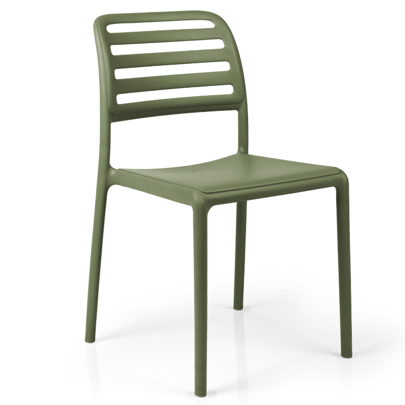 Градински стол Costa Bistrot Agave на марката NARDI. Без подлакътници. Стифиращ се (може да се подрежда един върху друг). Изработен от равномерно оцветени фибростъклени полипропиленови смоли с UV добавки. С неплъзгащи крака. Има матово покритие, което го прави устойчив на атмосферни влияния и UV лъчи и така позволява използването му на открито по всяко време на годината.