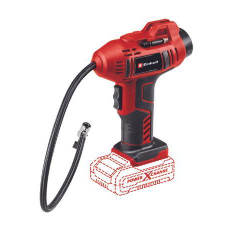 Акумулаторният мини компресор Einhell CE-CC 18 Li-Solo Power X-Change е с напрежение 18 V и максимално работно налягане 11 бара. Идеален за напомпване на автомобилни гуми, велосипедни гуми и топки, като се изключва се автоматично при достигане на зададеното налягане. Включени са 3 бр. адаптери за различните приложения. Оборудван е с цифров дисплей и ергономична дръжка, а маркучът с вентил има дължина 60 см. Интуитивната въздушна помпа се доставя без батерия и зарядно устройство.