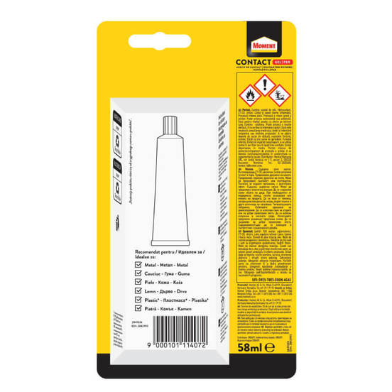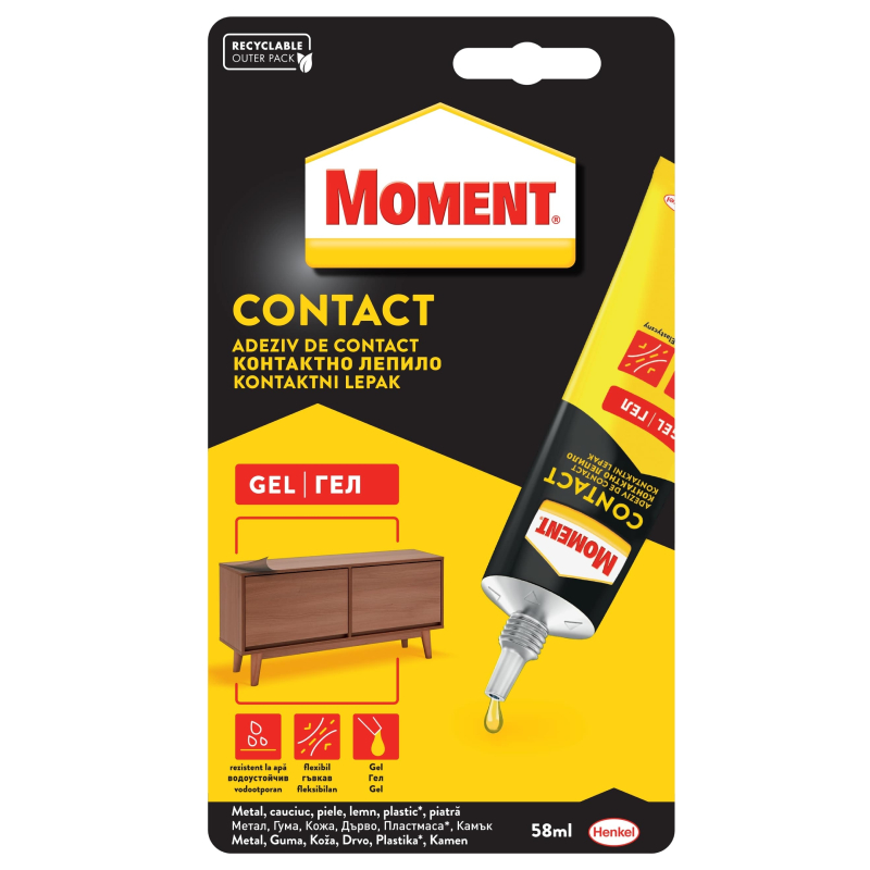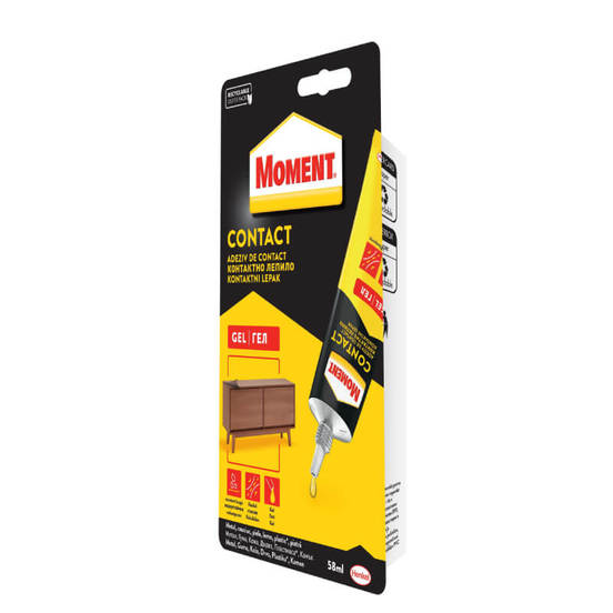 Moment Contact Gel е контактно лепило-гел за комбинирано лепене на дървени материали с декоративни ламинати. Идеално е за гума, кожа, корк, филц, твърдо PVC, мек пенопласт, метал и много други материали. С него ще закрепите звукоизолиращи, изолационни и акустични панели (освен експандиран полистирен, пластмасови плочки и различни видове покрития за стена (без твърдо PVC или синтетична кожа), фурнирни кантове и други. Прилагайте върху сухи, стабилни повърхности. Не е подходящо за полиетилен, полипропилен, експандиран полистирен, синтетична кожа и пластмасово PVC.