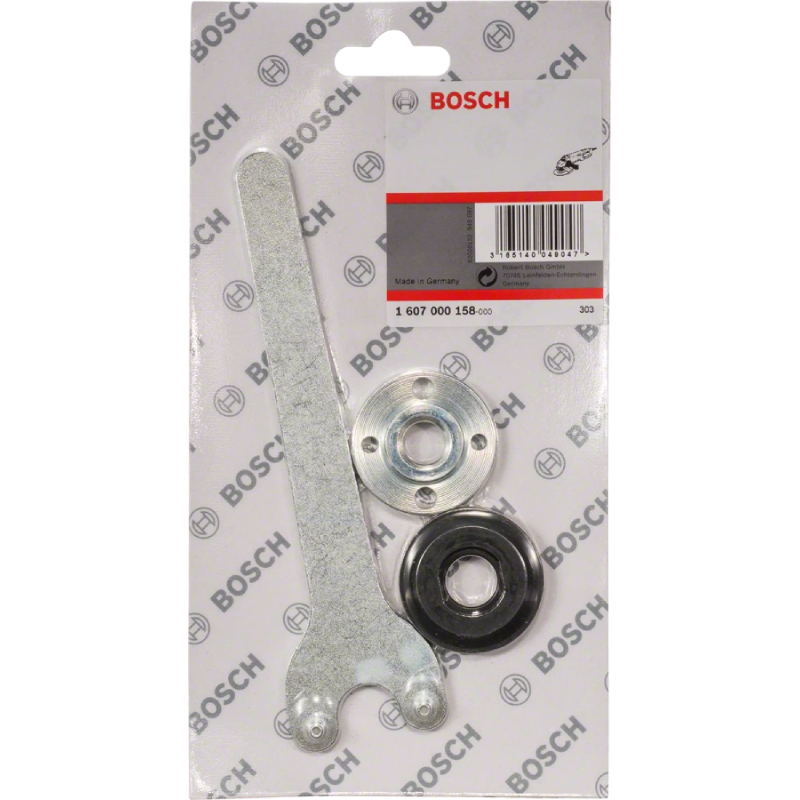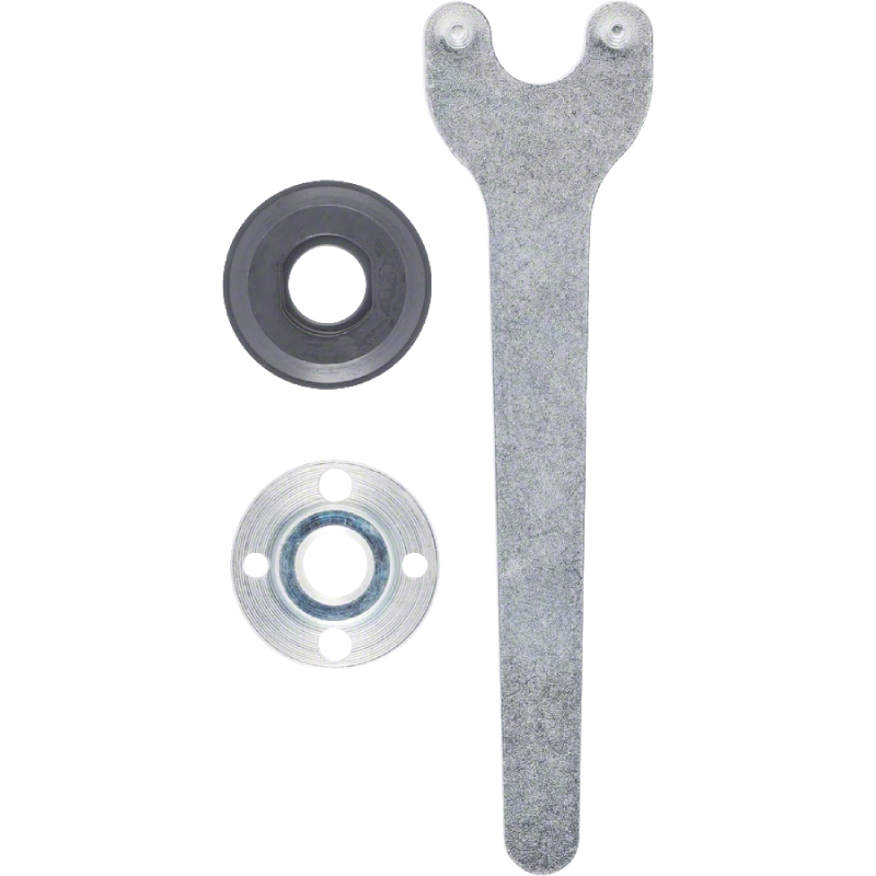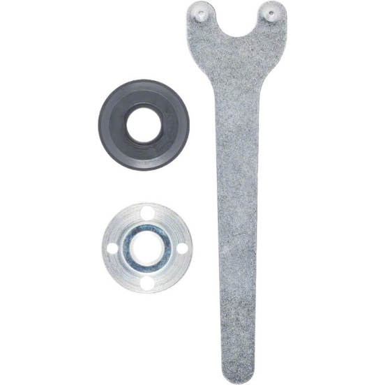 Комплект затегателни части за ъглошлайф съдържащ крайна гайка, фланец и двуотворен гаечен ключ.