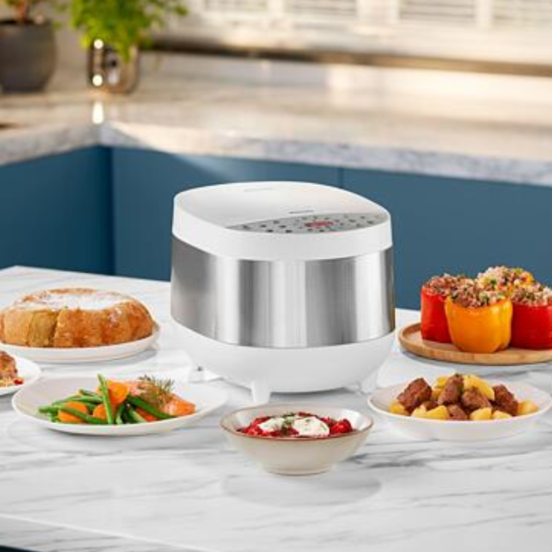 Мултикукърът Philips HD4713/40 е част от серията "Всичко в едно" и предлага изключителна комбинация от мощност, интелигентност и практичност. С мощност от 1300 W и компактни размери (375 x 280 x 245 мм), уредът е проектиран да бъде надежден помощник в съвременната кухня. Лесното управление с едно докосване и богатият избор от автоматични програми го превръщат в подходящ избор както за начинаещи, така и за опитни кулинари. Едно от ключовите предимства на уреда е системата за 3D затопляне, която разпределя топлината отгоре, отстрани и отдолу. Това осигурява равномерно сготвяне на храната, запазване на естествените ѝ аромати и сочност. Благодарение на тази технология, всяка рецепта - от ориз и зеленчуци до месо и десерти - се приготвя равномерно, без загаряне и без загуба на хранителни вещества. Philips HD4713/40 е оборудван с 60 предварително зададени програми за готвене, които обхващат огромен диапазон от кулинарни техники. С тях можете да приготвяте ориз, риба, месо, яхнии, каши, сладкиши и дори специфични рецепти като каша от зърнени култури или морски дарове. Всяка програма е внимателно разработена, за да поддържа оптималната температура и време за готвене, което гарантира винаги последователни и вкусни резултати.