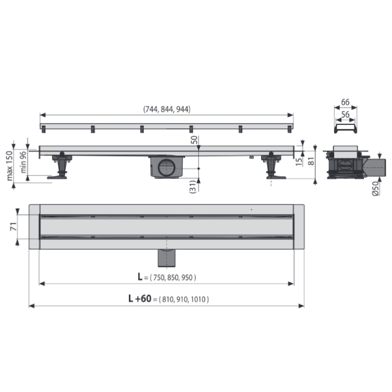 Линеен подов сифон за баня APZ13-DOUBLE9-850 на ALCAPLAST, произведен от неръждаема стомана (втвърден чрез ецване, пасивиране и електрохимично полиране) с диаметър на тръбата за отпадни води Ф50 мм. Линейният сифон за баня се предлага в комплект с двустранна решетка DOUBLE - от едната страна е плътна решетка, изработена от неръждаема стомана, а от другата страна има възможност за вграждане на плочки или водоустойчиво дърво с дебелина до 12 мм.