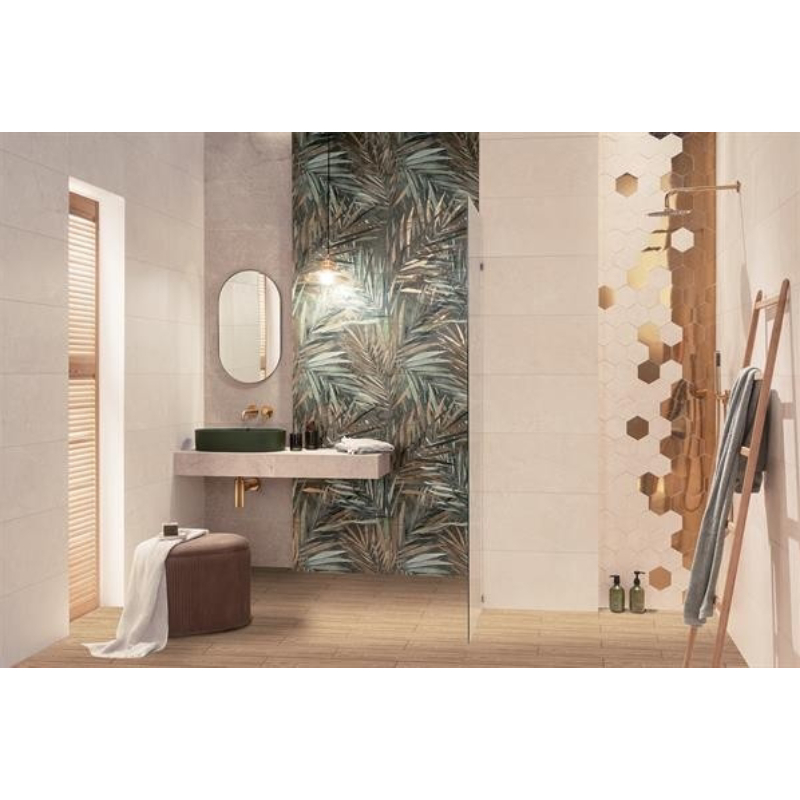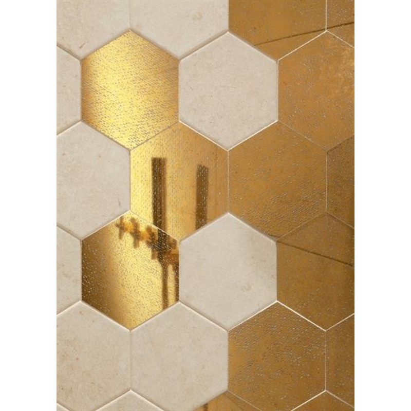 Шестоъгълни стенни плочки за баня - декор плочки Бихара Голд Хекса на TUBADZIN с гланцирана повърхност и релефна структура. Плочките са първо качество, произведени са в Полша и са с размери 11 х 12.5 см.
