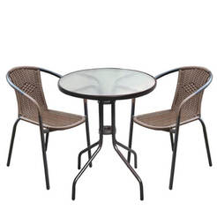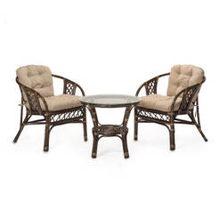 Красив и удобен градински комплект мебели Matador, състоящ се от три части - 2 стола и маса. Комплектът градински столове с маса e изработен от естествен ратан в цвят орех и се предлага в комплект с меки възглавници.