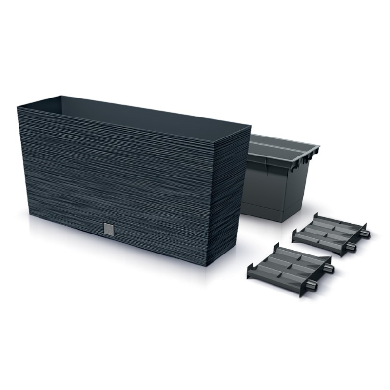 PVC кашпа от серията Furu Case М на марката PROSPERPLAST. Изработена от висококачествена пластмаса в цвят антрацит. Снабдена с вложка, която предотвратява разсипването на пръст, както и с преливен отвор и капачка. С оребрена структура, която допринася за нейната елегантност.