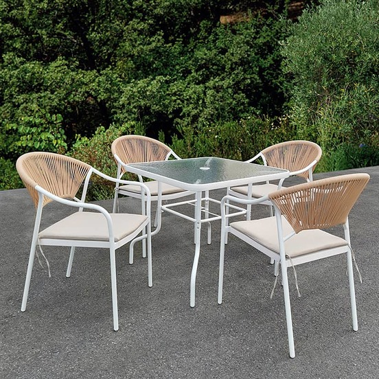 Градински комплект мебели от серия Paris, състоящ се от 5 части - маса и четири стола. Масата е произведена от висококачествена метална конструкция и с плот от закалено стъкло. Стъклото е с дебелина 5 мм. Столовете са изработени от метална конструкция в комбинация с изкуствен ратан.