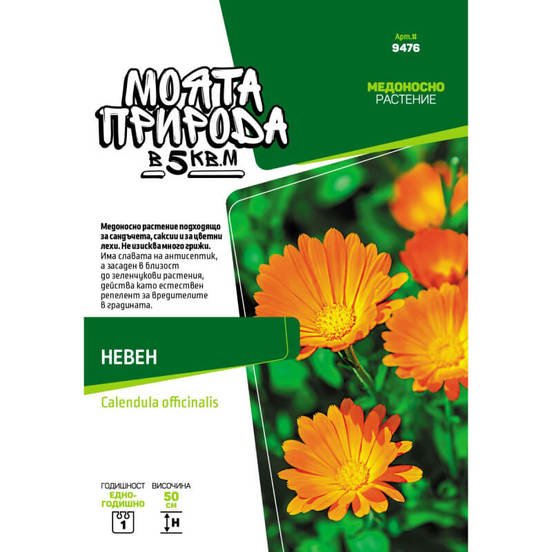 Семена за цветя Невен на марката МОЯТА ПРИРОДА. Едногодишно растение. Медоносно цвете, подходящо за сандъчета, саксии и за цветни лехи. Не изисква много грижи.