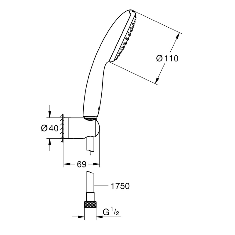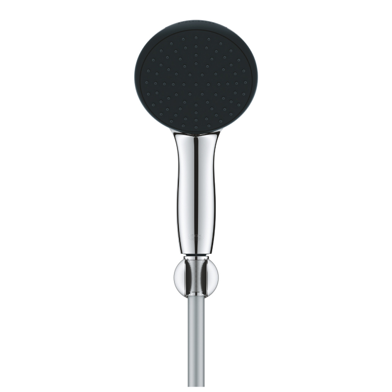 Ръчен душ Vitalio Start 110 с шлаух и държач на марката GROHE. Душът е с размер ф110 мм, а шлаухът е с дължина 1750 мм и има защита срещу заплитане.