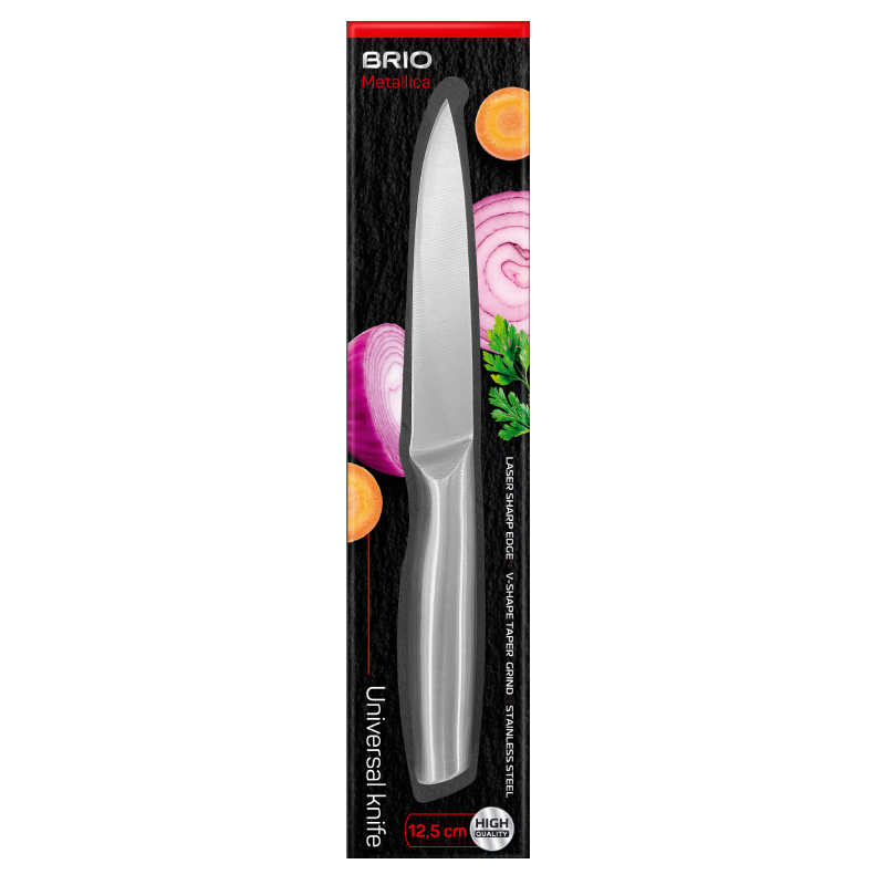Универсален нож от серията Metallica на марката BRIO. Ножът е с острие от неръждаема стомана с незалепващо покритие. Има лята метална дръжка, която е гаранция за удобство при употреба и дълготрайност.