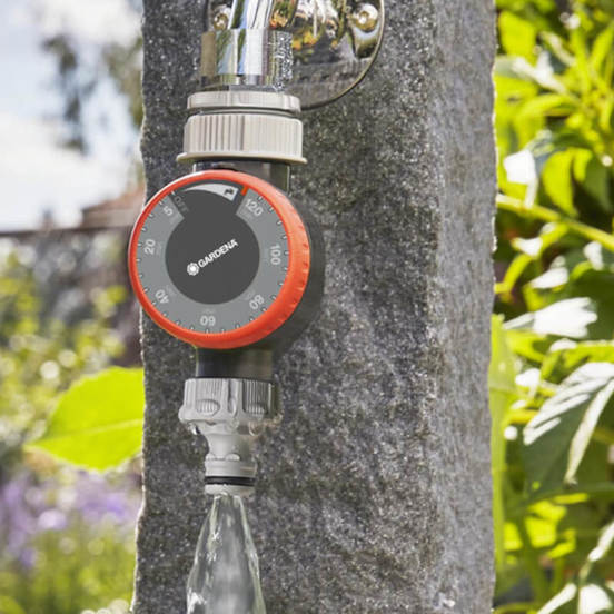 Таймер механичен за поливане на марката GARDENA. Таймерът се свързва към крана и автоматично изключва напояването на вашата градина, например разпръсквачи или система за капково напояване. Може да бъде програмирано време за поливане между 5 и 120 минути.