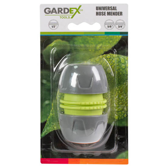 Съединител за маркуч 1/2", 5/8", 3/4" на марката GARDEX. Универсалният съединител е създаден така, че да пасва на маркучи с различни диаметри - 1/2", 5/8" и 3/4". Това позволява на потребителя да свърже различни видове маркучи без необходимостта от специални адаптери или съединители.