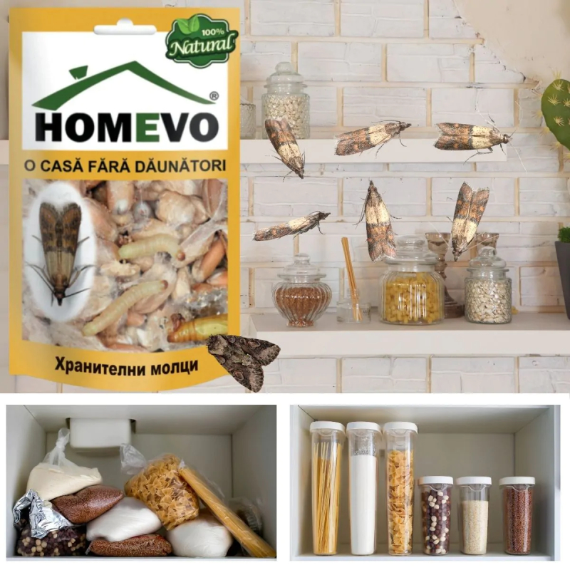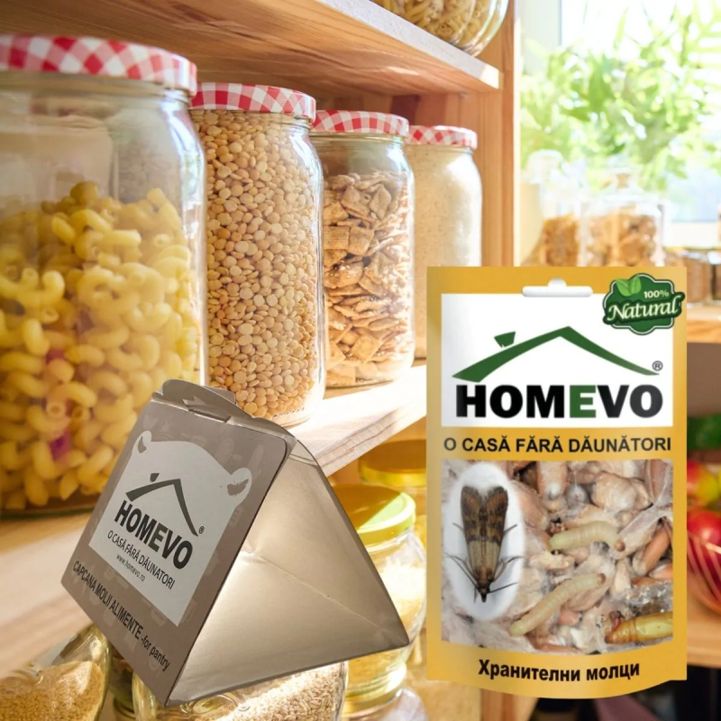 Homevo за хранителни молци е капан, който привлича и ги улавя. Благодарение на комбинацията от феромони, той привлича всички видове молци, като по този начин предпазва семена, зърнени култури, храни от нападение и разваляне.