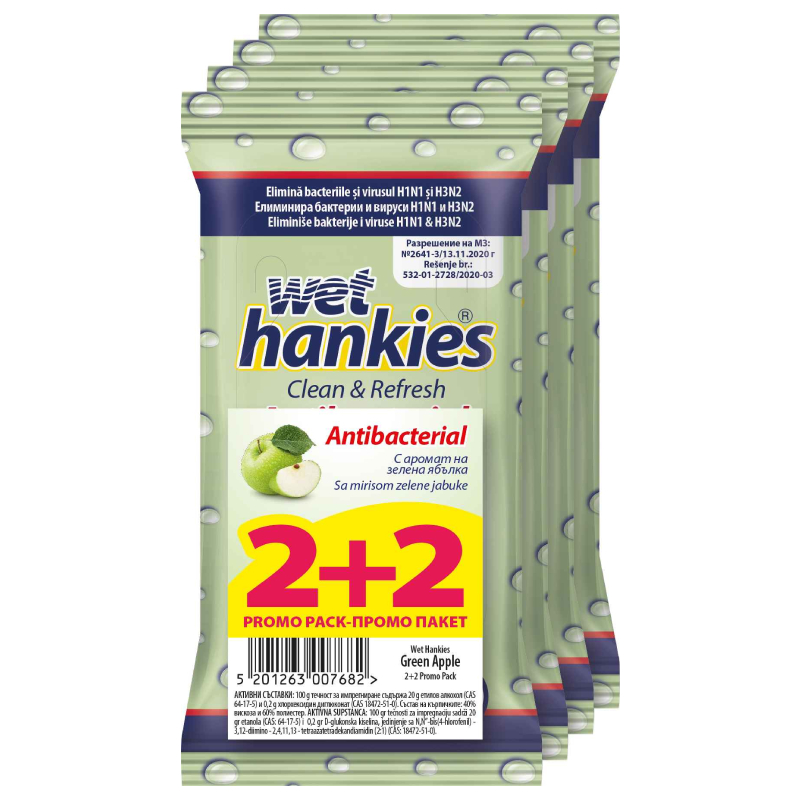 Мокри кърпички на марката WET HANKIES. Антибактериални, с аромат на зелена ябълка. Предлагат се в промо комплект от 2+2 пакета по 15 бр.