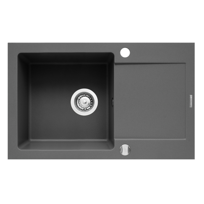 Гранитна кухненска мивка PYRAMIS с размери 79 х 50 см. Подходяща за вграждане в шкаф 60 см. Гранитната мивка за кухня се доставя с фабрично разпробити отвори - един за стоящ смесител и един за монтиране на механична врътка, чрез която може да запушите или отпушите сифона на мивката. Врътката контролира положението на автоматичния сифон чрез завъртане на ляво или на дясно. В едната позиция сифонът на мивката се запушва, а в другата се отпушва.