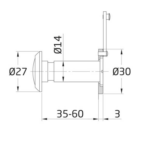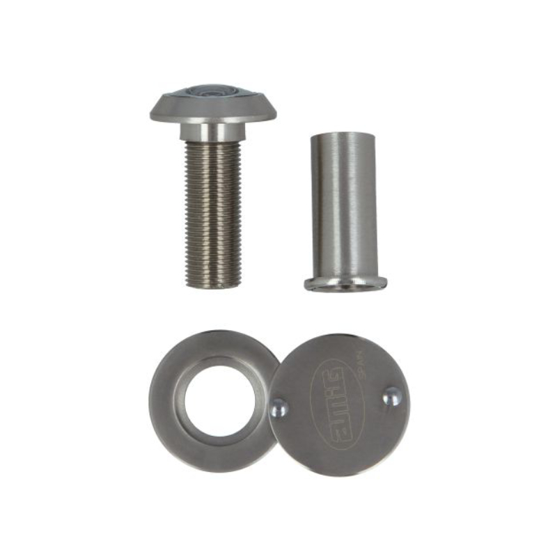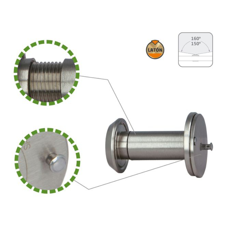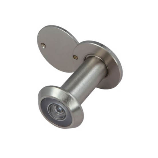 Шпионка за врата на марката AMIG. Широкоъгълна, с капаче. Шпионката е с размери 35 х 60 мм и диаметър ф14 мм. Материал: месинг. Цвят: хром мат.