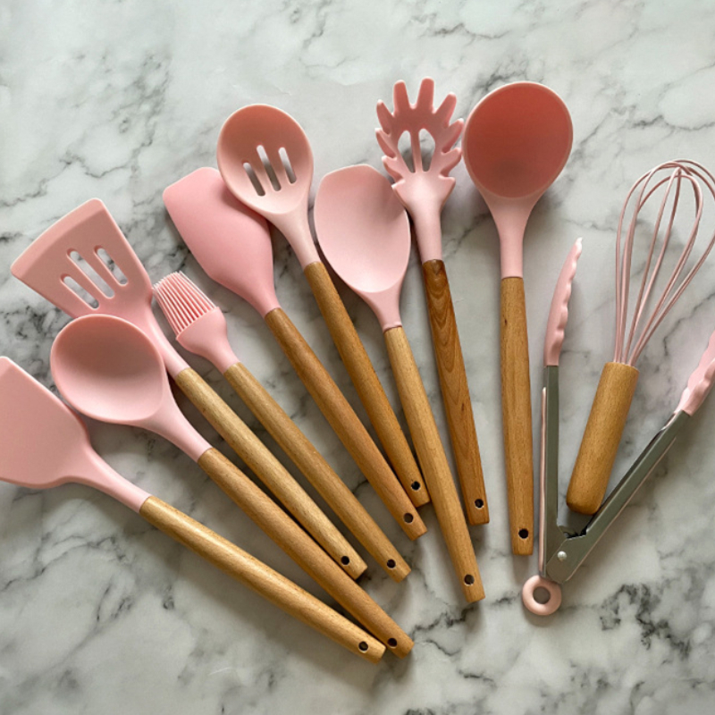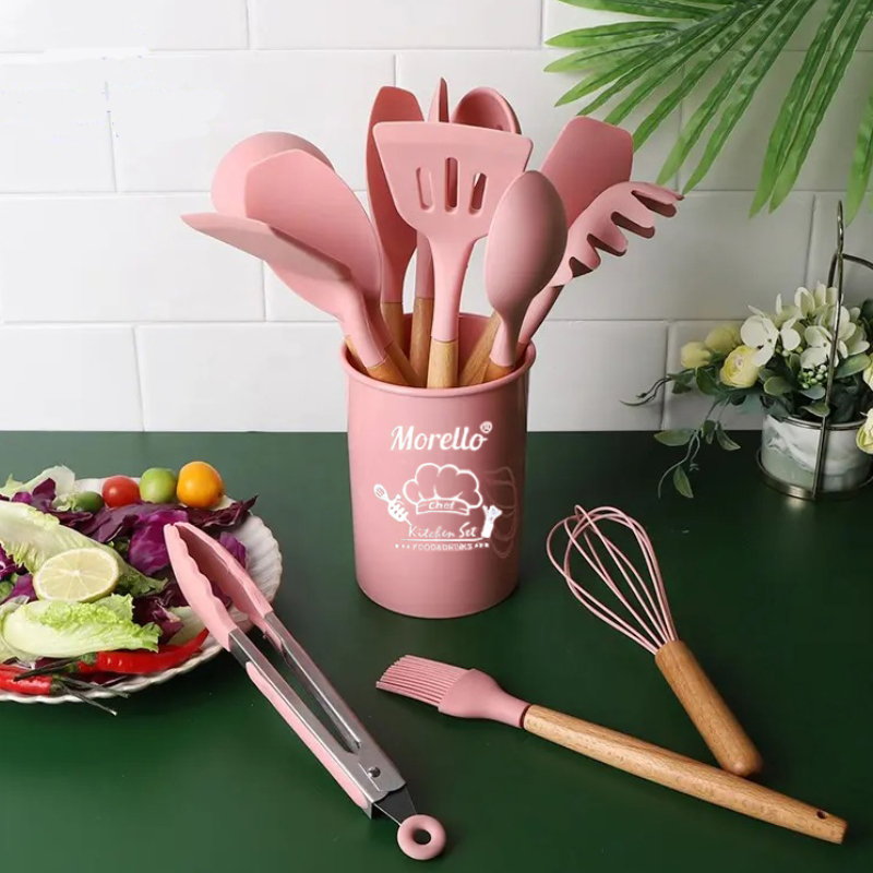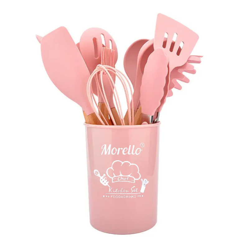 Прибори за готвене 12 части силиконови със стойка - антично розово