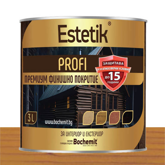 Маслен импрегнант за дърво Estetik Profi 15+ на марката BOCHEMIT. Цвят: дъб. Estetik Profi е премиум дълготрайно финишно покритие, разработено на базата на последно поколение висококачествени суровини (модифицирани смоли, UV филтри, восъци, вакси, премиум неорганични пигменти). Предназначен е за боядисване и дълготрайна защита на дървени изделия в интериор и екстериор. Estetik Profi прониква дълбоко в структурата на материала, създавайки здраво, дълготрайно и еластично покритие, което подчертава естествената красота на дървесината.