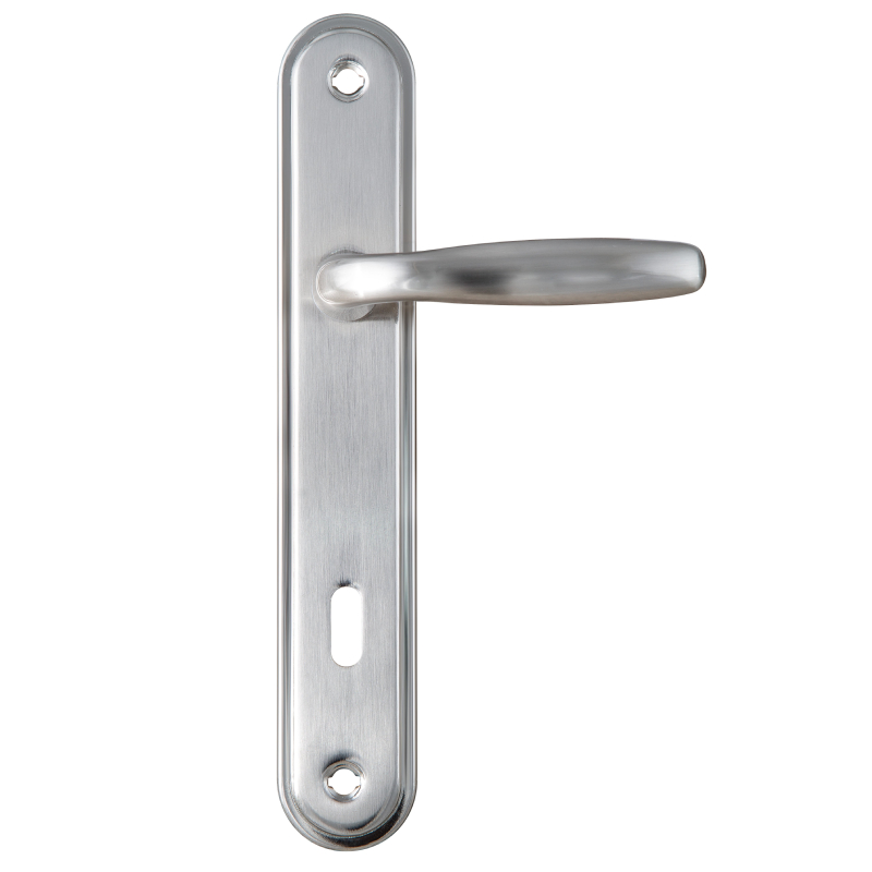 Обикновена дръжка за врата от серията Deka на марката YALE. Междуцентрие: 90 мм. Шилдовете са изработени от стомана, а ръкохватките - от цинко-алуминиева сплав. С цял шилд и пружина. Дръжките са подходящи за интериорни врати.