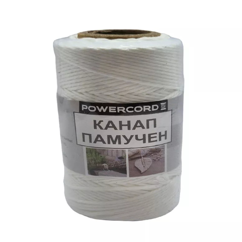 Памучен канап на марката POWERCORD в цвят бял. Канапът е в разфасовка от 60 грама и дължина 80 м. Предлага се във вид на ролка, което улеснява неговото пренасяне и използване. Материята на канапа е функционална както за битови нужди, така и в строителните и промишлени дейности.