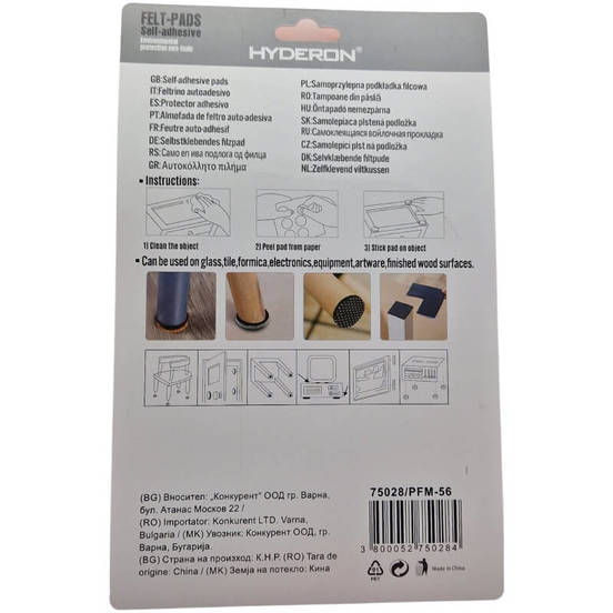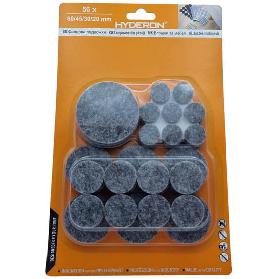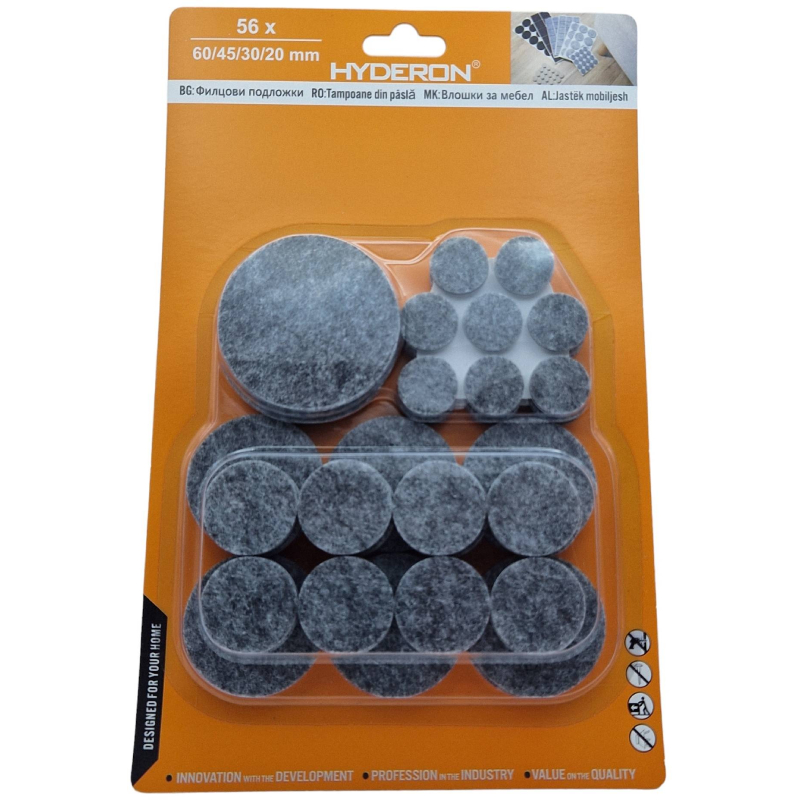 Подложки филцови самозалепващи кръгли микс, сиви на марката HYREDON. Опаковка: 56 бр./пакет: 24 бр. х ф20 мм/16 бр. х ф30 мм/12 бр. х ф45 мм/4 бр. х ф60 мм.