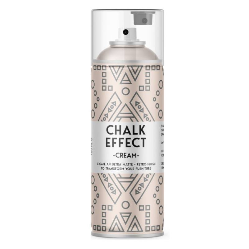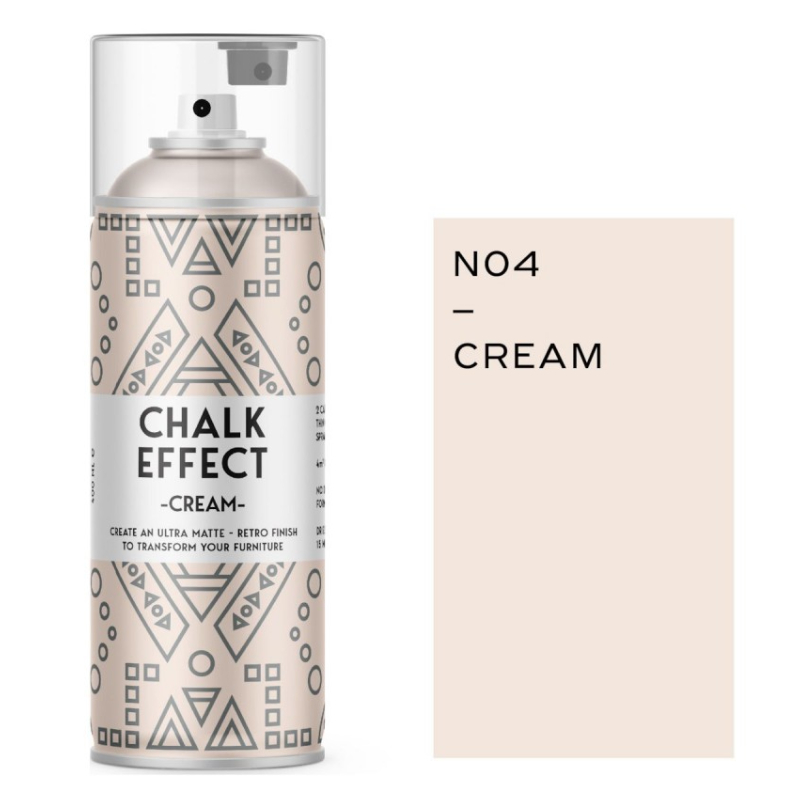 Преобразете мебелите и декорациите си с акрилния спрей боя COSMOS Chalk Effect в цвят "Крем" № 4 - нежен, матов и с характерен тебеширен ефект, който внася топлина, уют и винтидж усещане във всяко пространство. Този 100% акрилен спрей е подходящ за различни повърхности като дърво, метал, неръждаема стомана, стъкло, керамика, камък, текстил, хартия и други. С отлична покривност и лесно нанасяне, боята е перфектна както за любители на DIY проекти, така и за професионалисти. Оборудвана е с две дюзи - бяла за детайлна работа и черна за бързо покриване на големи площи, което гарантира равномерно боядисване без капки и дефекти.