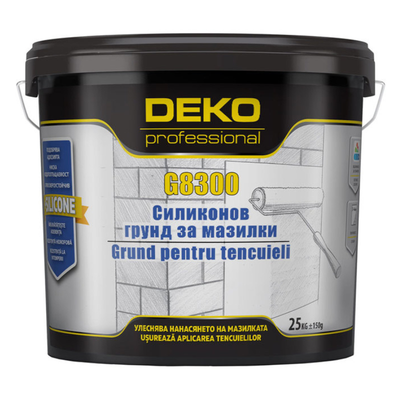 G 8300 Deko Professional е висококачествен силиконов грунд, предназначен за подготовка на различни минерални и полимерни основи преди нанасяне на декоративни мазилки и релефни покрития. Грундът създава стабилна и равномерна повърхност, подобрява адхезията на последващите покрития и улеснява тяхното полагане. Осигурява устойчивост на атмосферни влияния и дълготрайна защита на основата. С негова помощ се постига отлична цветна база при работа с цветни мазилки.