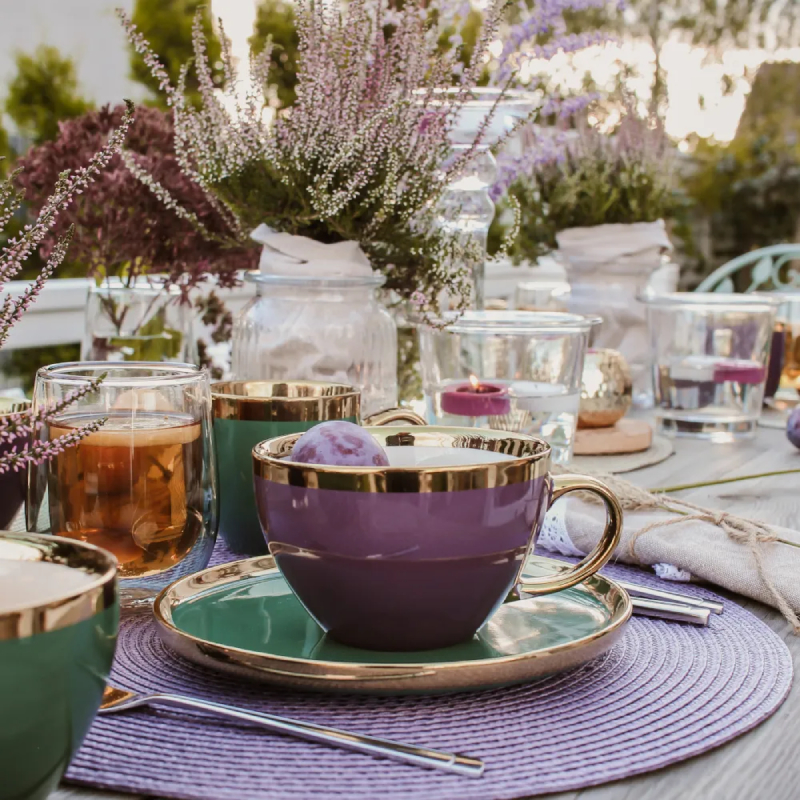 Формата ѝ е стабилна и елегантна, а масивната дръжка, изцяло покрита с блестящо златно покритие, осигурява удобен захват и придава усещане за лукс. Декорацията в злато и нюанси на лилаво е хармонично съчетана, съобразена с актуалната тенденция mix & match, където различни елементи се комбинират в стилна визия.