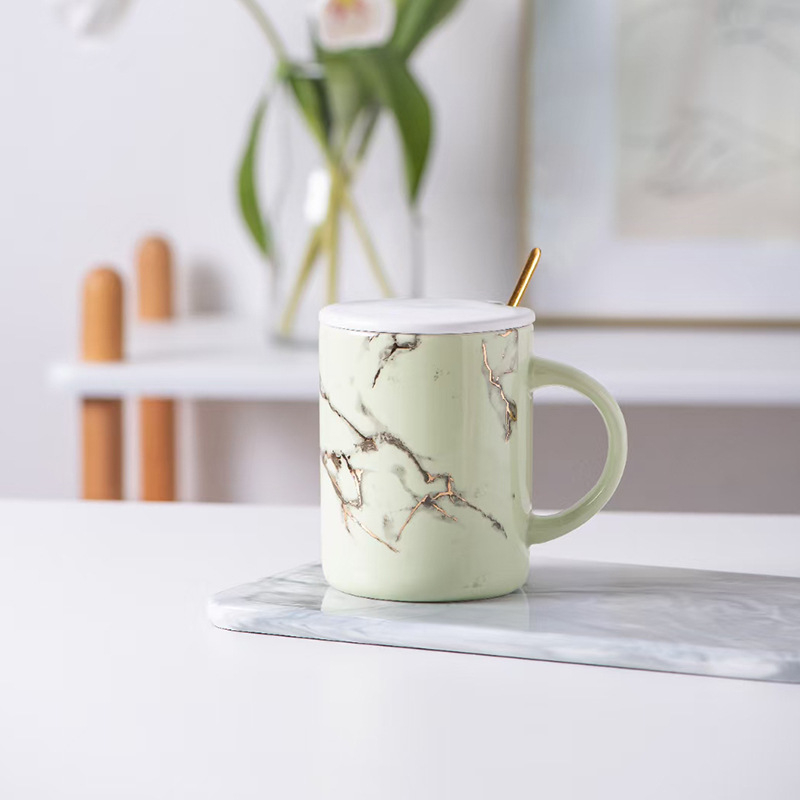 Елегантна и практична, тази порцеланова чаша съчетава модерен дизайн с удобство за ежедневна употреба. Нейният ефектен зелен мраморен десен, украсен с фини златни елементи, ѝ придава луксозна визия. С вместимост 400 мл и включени порцеланово капаче и лъжичка, чашата е идеална за чай, кафе или други топли напитки у дома или в офиса.