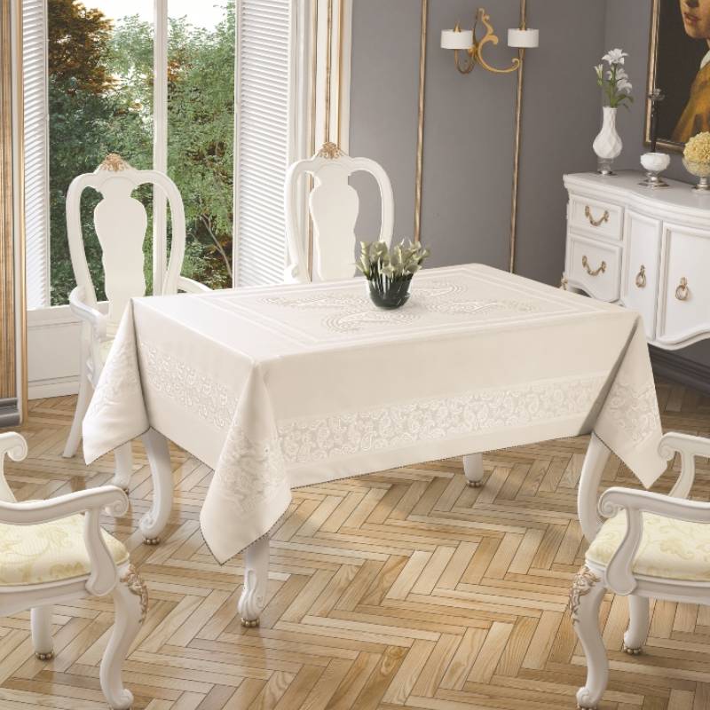 Покривката за маса с размери 160 x 220 см е изработена от 100% полиестер, което я прави издръжлива и лесна за поддръжка. Нейният мек кремав цвят внася топлина и изисканост в интериора, създавайки уютна и приветлива атмосфера около трапезата.
