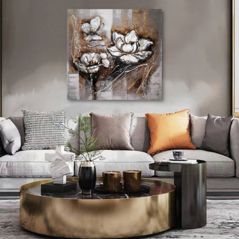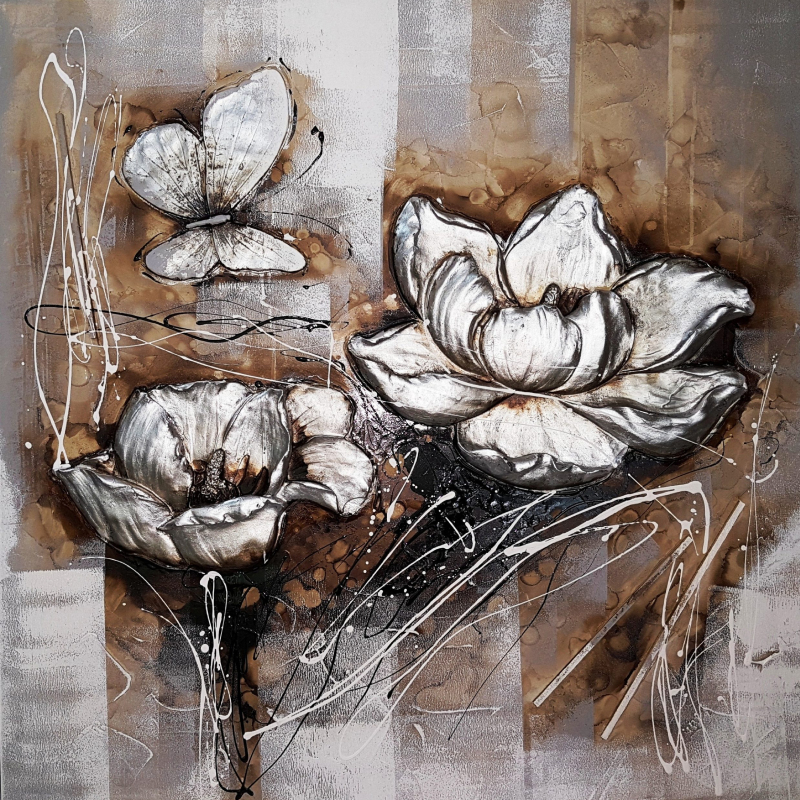 Ефектна декоративна картина с релефни флорални елементи, изработена с внимание към всеки детайл. Композицията изобразява два големи мака в изискани сребристи нюанси, допълнени от нежна пеперуда, разположени върху елегантен сиво-бял фон. Релефната текстура придава дълбочина и изразителност, превръщайки картината в истински акцент за интериора.