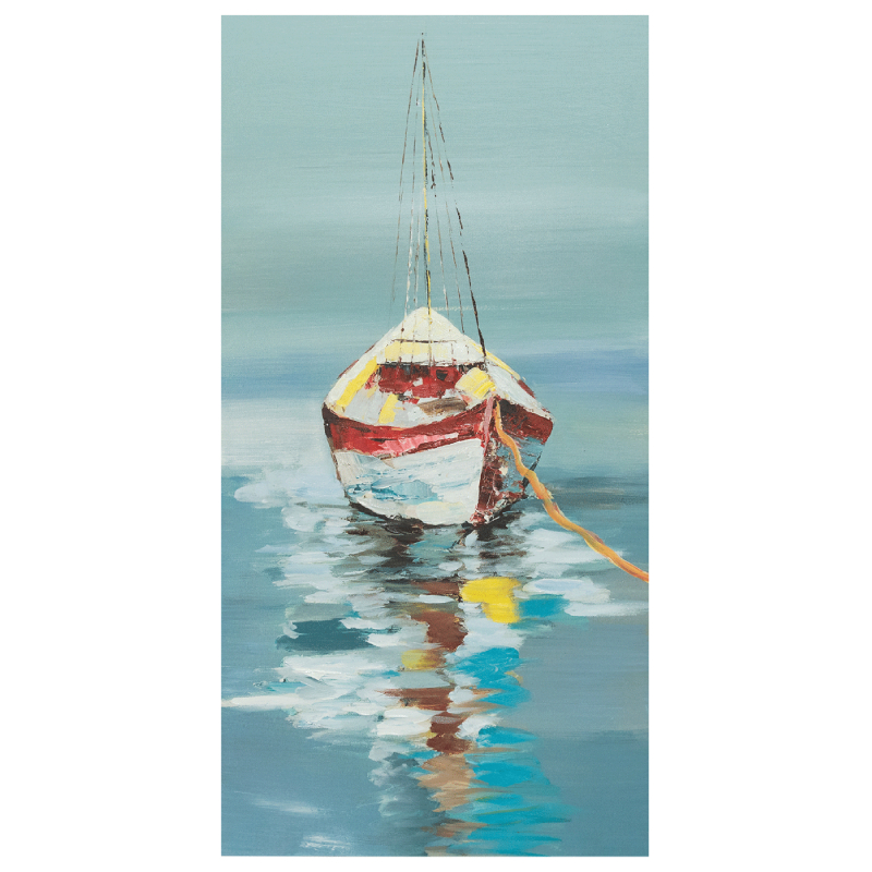 Внесете усещане за покой, уединение и хармония във вашето пространство с тази изразителна маслена картина, изобразяваща лодка в спокойно море. Създадена върху висококачествено платно и опъната върху здрава дървена подрамка, тази творба привлича вниманието със своята деликатна композиция и пъстри, ръчно нанесени маслени цветове. Лодката, плаваща в неподвижна вода, символизира вътрешен мир и съзерцание, докато морето носи усещане за безкрайност и дълбочина.
