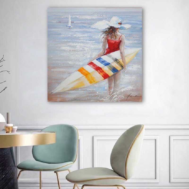Изразителна и стилна картина, която улавя усещането за свобода и спокойствие, вдъхновена от морето. В центъра е изобразено нежно момиче, обгърнато от синьото на морската шир и топли нюанси на червено и бежово, създавайки динамична и хармонична композиция.