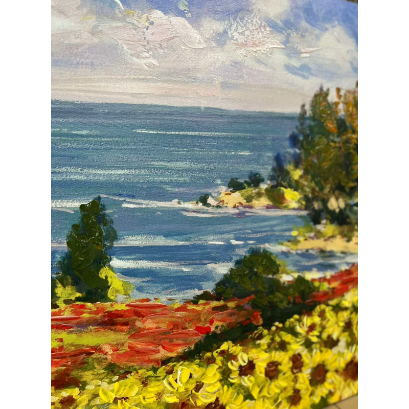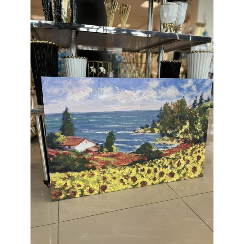 Открийте спокойствието на природата с картината "Слънчеви поля и морски бриз". Ярките жълти полета се съчетават с морските сини и зелени нюанси, създавайки усещане за лекота и свежест в интериора. Творбата пресъздава идеалната хармония между земята и морето, като вдъхновява за релакс и спокойствие.