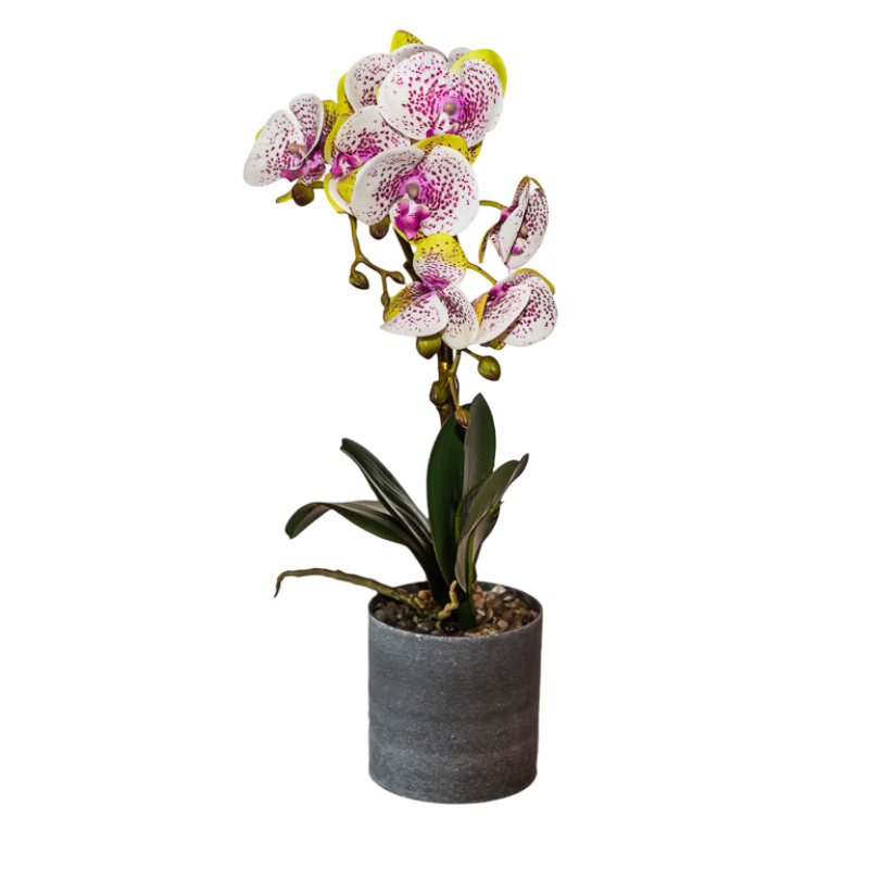 Добавете стил, свежест и изящество в интериора си с тази елегантна изкуствена орхидея в кашпа, която ще озари пространството Ви без нужда от грижи. С реалистична визия, фина изработка и наситени цветове, орхидеята съчетава естествена красота и дълготрайна декоративна стойност. Тя е изработена от висококачествени материали, които я правят неразличима от истинско цвете - с детайлно изработени венчелистчета, натурално изглеждащи листа и стилна кашпа, която подчертава изисканата ѝ осанка.